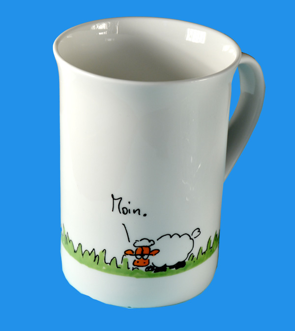 Das Material ist FINE BONE CHINA, (deutsch: feines Knochenporzellan), aus dieser Tasse schmeckt der Kaffee wirklich toll und lockt auch ein Schmunzeln (mindestens) auf die Lippen.