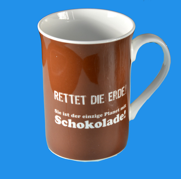 "Rettet die Erde. Sie ist der einzige Planet mit Schokolade." Da fällt einem doch sofort die Naschkatze ein, der man schon immer sagen wollte, wie lieb man sie hat. Diese große Tasse (Becher, Pott usw.) eignet sich als Mitbringsel zum Kaffee oder einfach mal so.